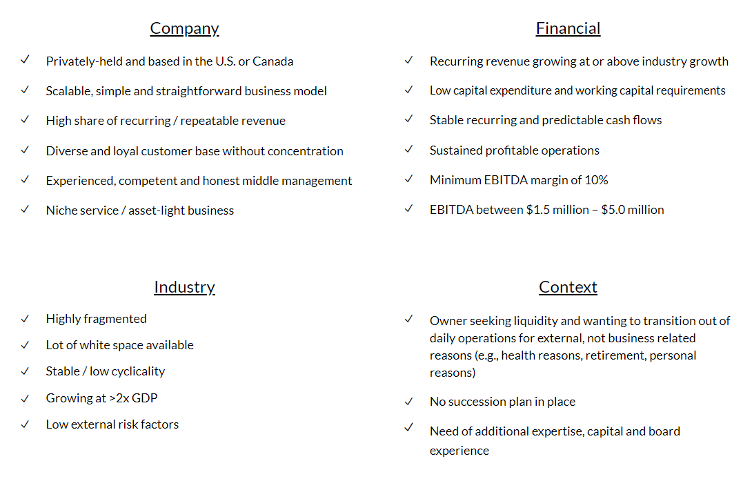 Capend Capital plans to acquire and operate a profitable company where the existing owner is seeking to transition out of the business. Below are some characteristics of an ideal acquisition target: